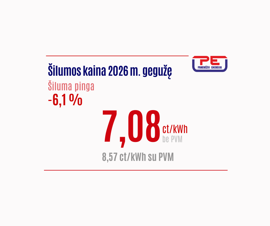 Nuo 2026 m. gegužės 1 d. nustatyta AB „Panevėžio energija“ centralizuotai tiekiamos šilumos kaina už suvartotą šilumos kiekį sudaro 7,08 ct/kWh (be PVM). Palyginti su balandžio mėnesiu, šilumos kaina mažėja 0,46 ct/kWh, arba 6,1 proc. Visi vartotojai už šilumą mokės 8,57 ct/kWh (su 21 proc. PVM).
